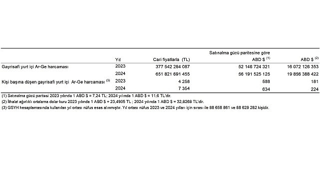 Gayrisafi yurt içi Ar-Ge harcaması 2024 yılında bir önceki yıla göre 274 milyar 279 milyon TL artarak 651 milyar 822 milyon TL’ye yükseldi.